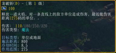 技能介绍:不管是耗蓝、冷却还是伤害,龙破斩都是一个非常优秀的AOE技能。和大多指向性AOE技能一样,可以点人放也可以点地放,因为其最大距离要比施法距离远很多,所以大多数时候都是点地放,对着树林放,跨越地形放这些都是常识问题了。