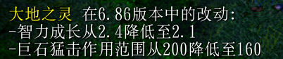 在6.86地图版本中,对土猫再次进行了削弱,智力成长降低,意味着6级过后连招前更需看一眼自身的蓝量,降低了巨石猛击的作用范围的改动就需要实战中踢得更准,预判走位更精确些。
