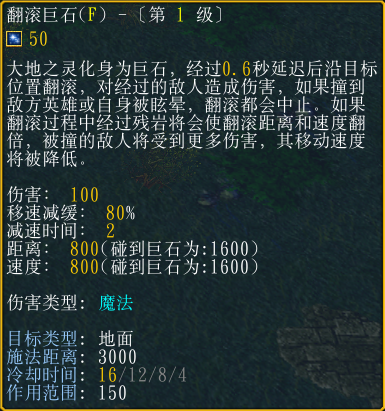使用思路:“翻滚巨石”是土猫的核心技能,正是因为这个技能的存在使得这个英雄拥有了灵活、机动性强的特点,释放后可选择向技能运动路径上放置残岩提升速度及运动距离,实战中用来赶路、追杀、逃跑、到达特殊地形都是非常不错选择,另外许多土猫玩家觉得这个技能释放后无法改变方向是错误的,在土猫有了原力法杖(推推)的情况下是可以选择性的改变F的释放方向,让自己及时“悬崖勒马”,亦或是大秀一波演技。