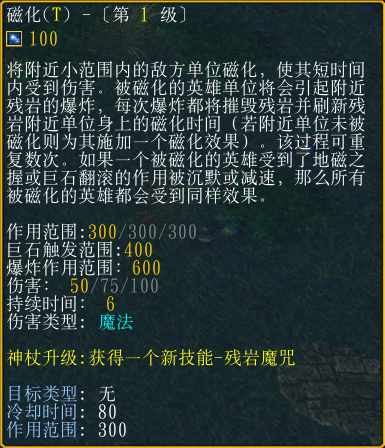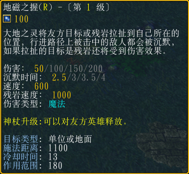 使用思路:“地磁之握”对于土猫来讲前期是一个沉默+伤害技能,开局可用来拉残岩、己方小兵、受己方控制的单位(支配的野怪及召唤物),中后期在有A杖的情况下还可以用来拉己方英雄单位或被释放残岩魔咒的敌方英雄单位。