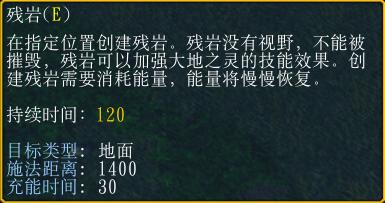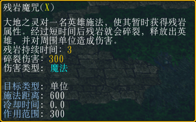 使用思路:“残岩魔咒”为土猫的A杖衍生技能,可对己方或敌方英雄单位释放,释放后会让指定英雄单位获得3秒的残岩属性(无敌),如果是对敌方英雄单位释放则此目标3秒钟后会受到300点魔法伤害,同时会对其周围300码范围的的敌方单位造成300点魔法伤害,实战中通常用来后手救己方队友或者先手将对方英雄变成残岩后配合R(地磁之握)及D(巨石猛击)将其踢给队友集火秒掉,及其少数情况下用来将己方队友变成残岩踢向对方(配合没有跳刀的大控:猛犸、牛头、潮汐等)。